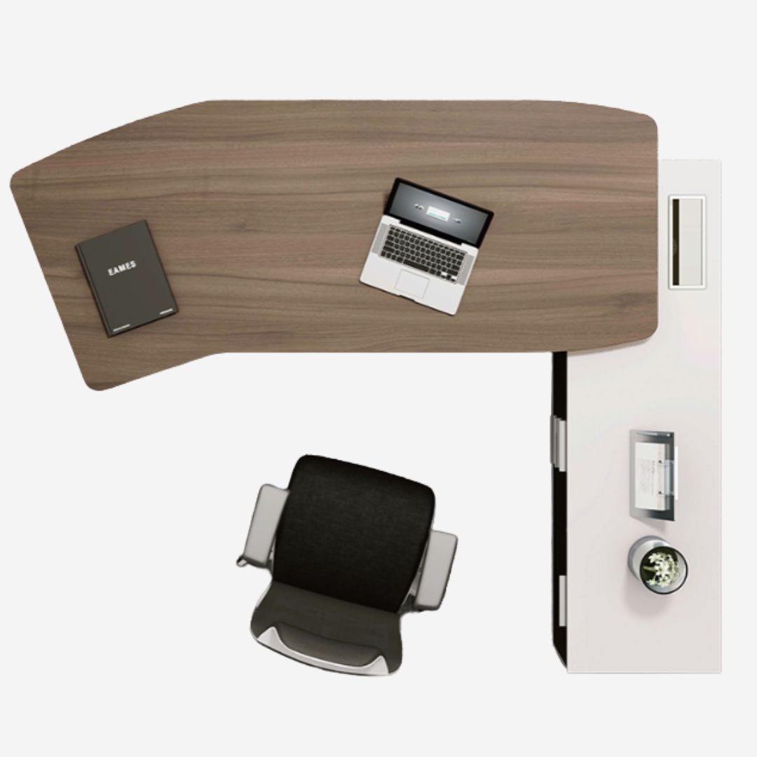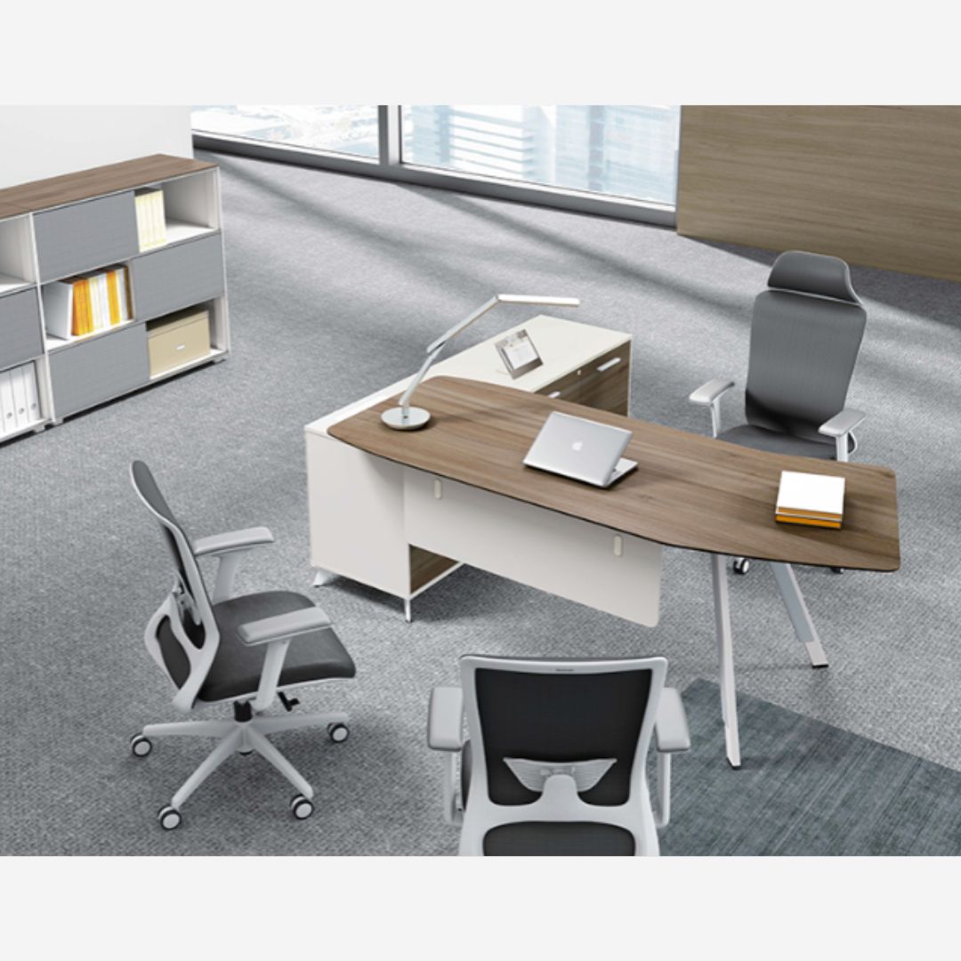 • Contemporary Design: 7-foot ergonomic curved top with beveled edges, walnut laminate finish, and a white & walnut accent credenza.
